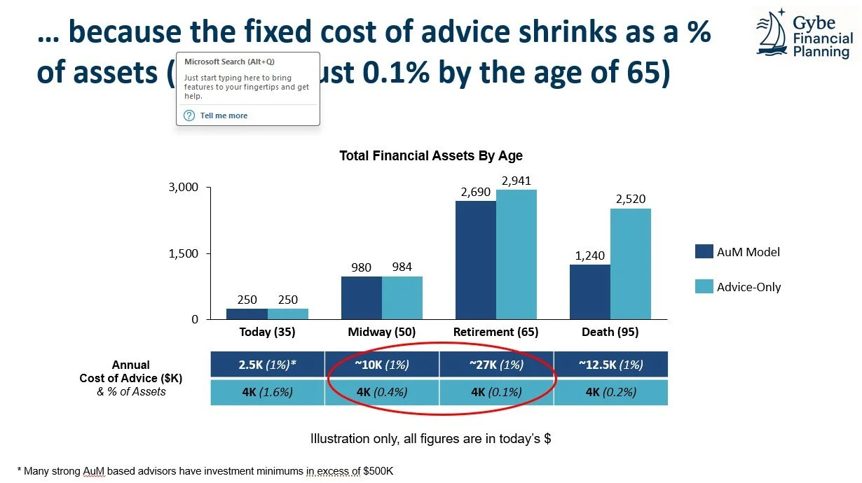 Option 3- Ongoing Advice-Only Financial Planning (AoP). This is often a “fixed fee” model of ~2,500-5,000+ per year which on significant investment balances can be much less than 1% per year. The level of planning (and hence value add) is also usually directly related to the fees charged. In this model the client manages their own investments or pays separately for investment management. Most AoP planners are not securities licensed and cannot discuss or recommend specific investments but can add value on asset allocation and assessing the costs of your current investments.