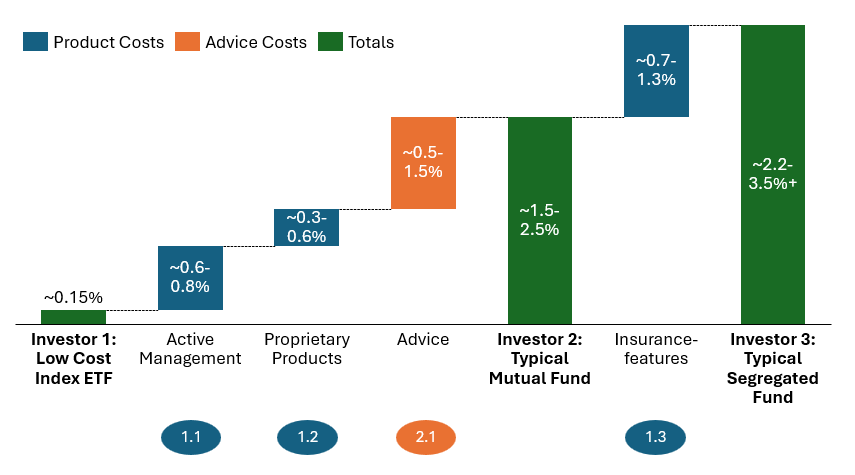 This deserves a post on its own, but as a general rule products sold by insurance companies that combine investment and insurance features come at a significantly higher cost than purchasing insurance and investments separately. For example Segregated Funds sold by insurance companies include insurance-like features such as guaranteeing 75% or 100% of the principle over a period of often 10 years or in the event of death of the policy holder. These funds often have MERs in excess of 3% and additional sales charges and commissions to cover the cost of advice. Segregated funds often also include the costs of active management, and proprietary products but the insurance features add an additional ~0.7-1.2% in further costs.